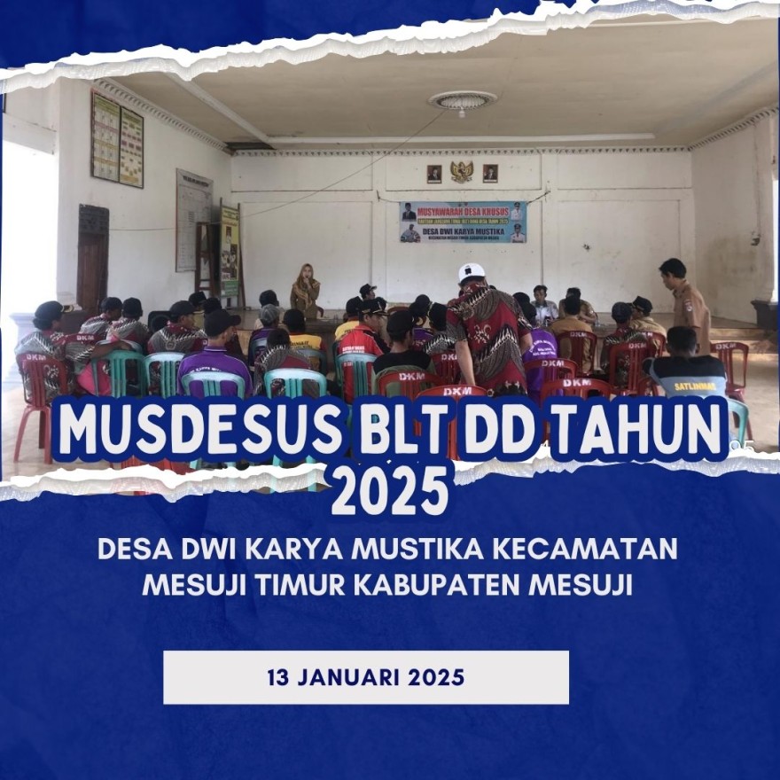 Berdasarkan Permendes 13 Tahun 2023 tentang salah satu prioritas penggunaan Dana Desa Tahun 2025, dimana anggaran maksimal ditetapkan 25% untuk anggaran BLT, maka Pemerintah Desa Dwi Karya Mustika melaksanakan Musdes Khusus terkait penetapan KPM Bantuan Langsung Tunai Dana Desa (BLT-DD) Tahun 2025, di Desa Dwi Karya pada tanggal 13 Januari 2025.